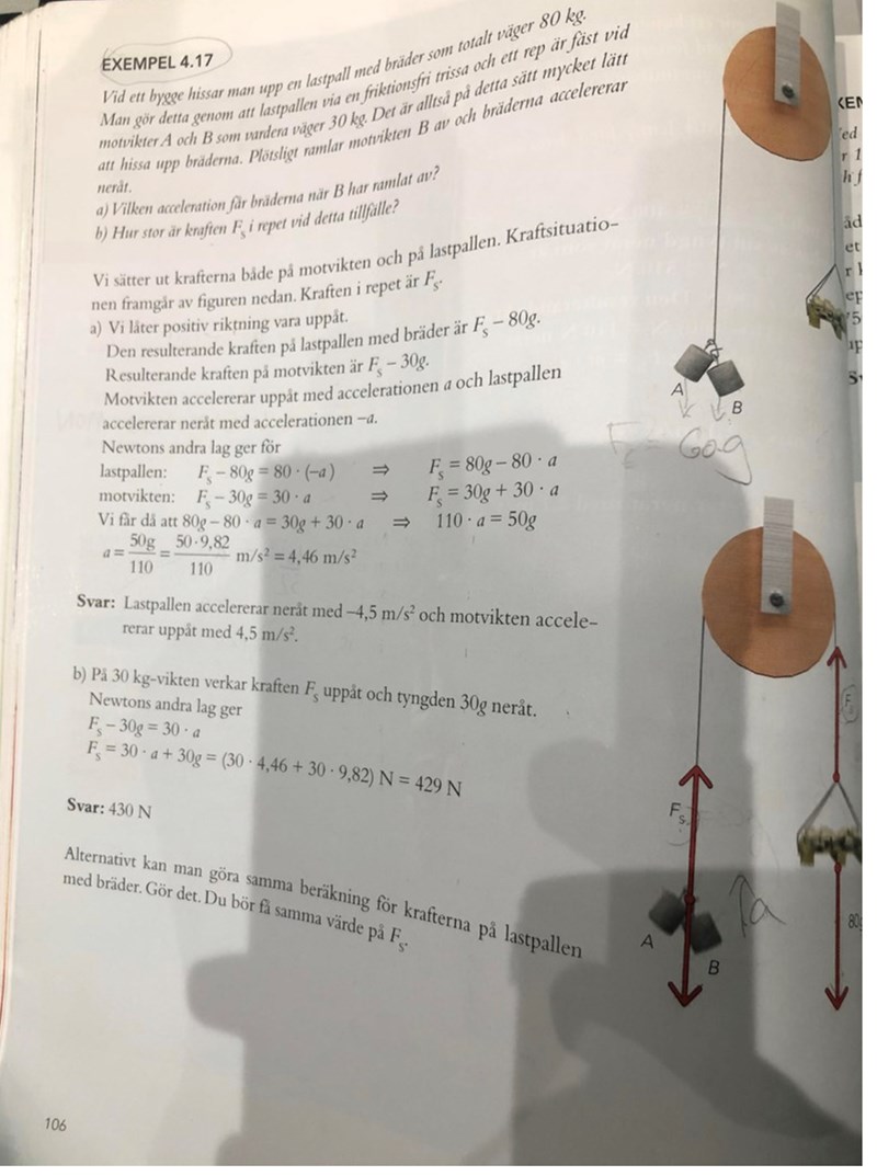 Jag förstår inte varför boken räknar med en massa på 30*g istället för 60*g på vikterna. Spännkraften i repet ska vara det samma i både sidorna därför att det är en och samma rep. Däremot förstår jag inte vrf man skriver 30g istället för 60g