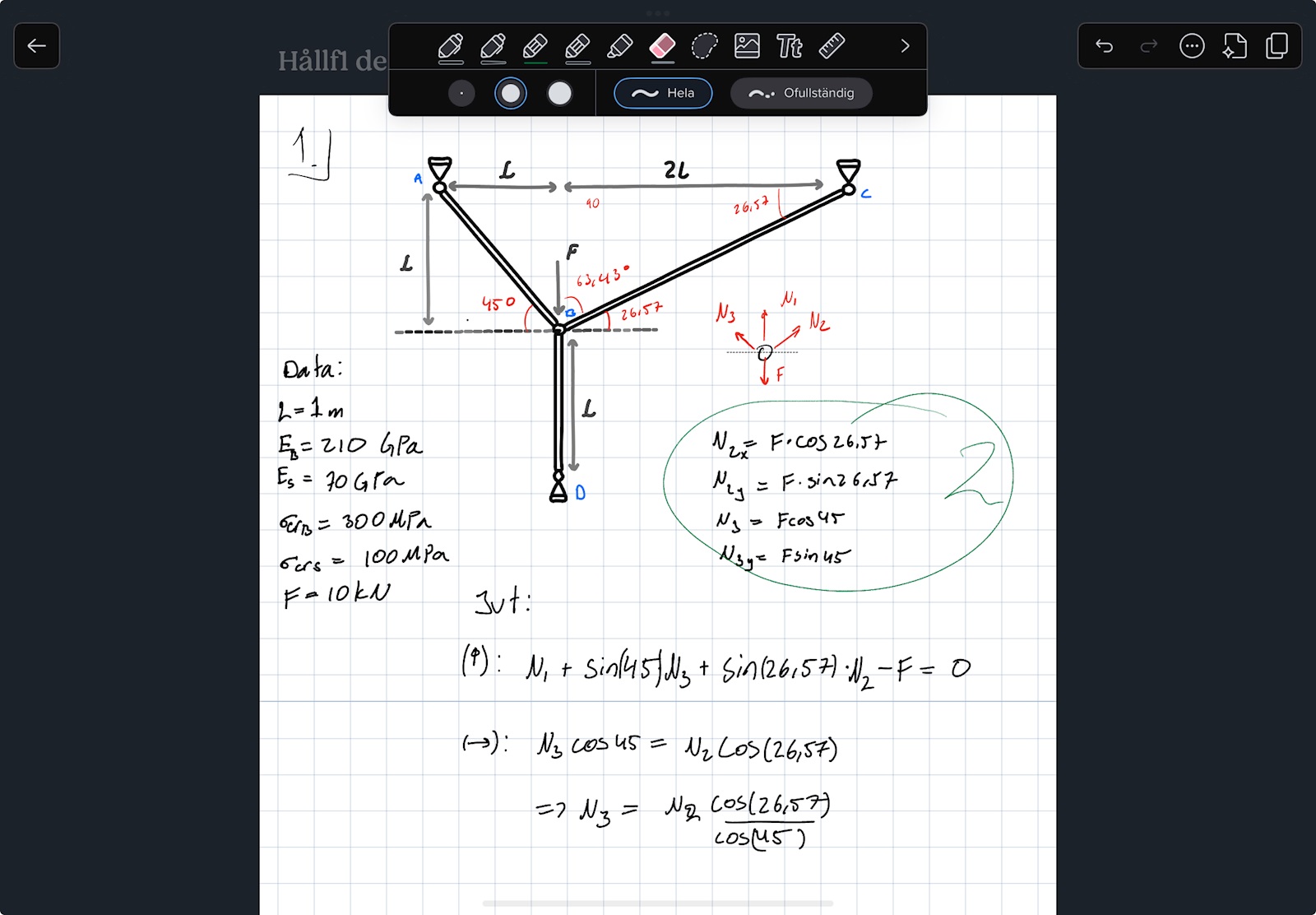 Jag tror det är tänkt att du bara har två okända stagkrafter, N3N_3 och N2N_2 i din bild. Det ger dig två ekvationer och två okända.
