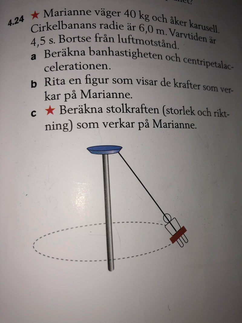 1. I uppgift c ska man beräkna normalkraften. Denna beräknar facit mha Pythagoras sats, vilket resonemang ju funkar. Jag tänker dock att man även bör kunna lösa ut normalkraften genom att subtrahera resultantkraften, dvs centripetalkraften (Fres=Fc), med tyngdkraften. Detta eftersom resultantkraften väl är summan av de befintliga krafterna, dvs normalkraften och tyngdkraften?