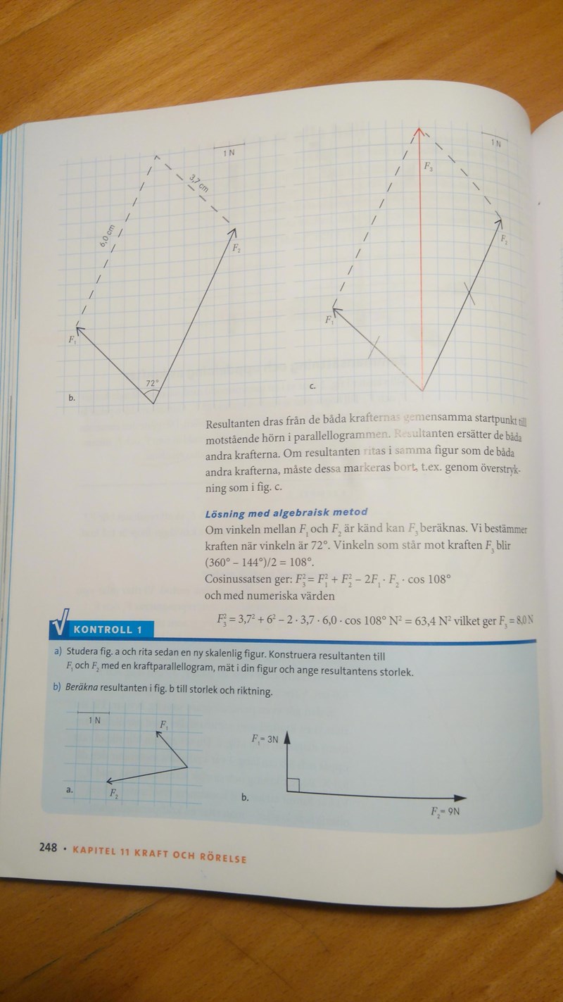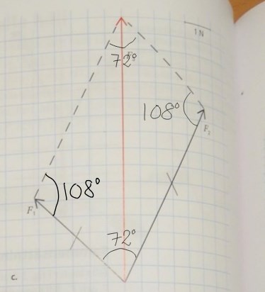 Vad gör de sen? ''vinkeln som står mot kraften F3 (Vart? Är denna vinkeln, i vilket hörn?) blir (360 - 144)/2 = 108 (vad kommer 144 ifrån?)