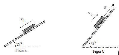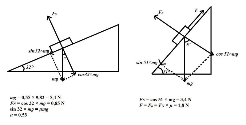 En kloss som väger 0,55 kg ligger på en bräda. När brädan lutar 32⁰ glider klossen med konstant hastighet v₁ nerför brädan. Se figur a. Brädan lutas sedan till lutningen 51⁰ och klossen dras med konstant hastighet v₂ uppför brädan. Se figur b.