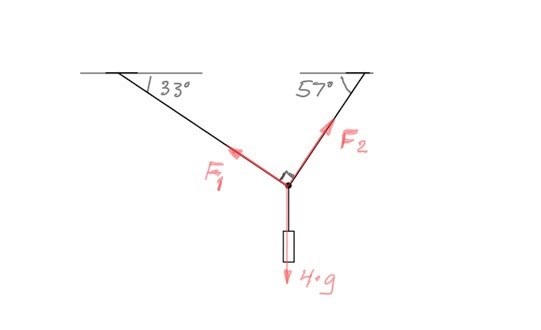 25 N. En vikt med massan 4,0 kg hänger i de båda trådarna som är fästa vid A och C. Vinkeln