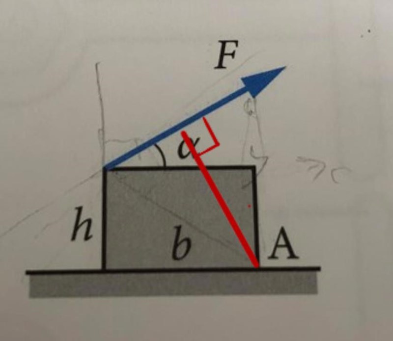 Testa först och främst att göra det jag skrev. Rita en linje från A till F:s verkningslinje som är vinkelrät till den senare. Är längden på den linjen lika med cos(alfa)*h?