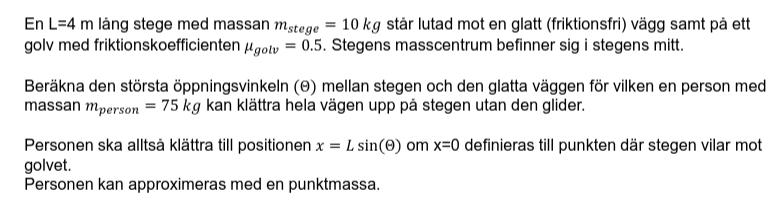 Jag har lite svårt med masscentrum, när personen är längst upp, kommer tyngskraften mätas från både personen och även mitten av stegen? Och hur ska jag relatera vinkeln för krafternas formler?