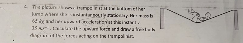 Fel, fel, fel. Accelerationen är 35m/ss (tryckfel i boken). Alla krafter som verkar på tjejen är F från trampolin och mg från gravitation. Räkna med F=ma där F är summan av alla krafter på gymnastinnan alltså F-mg. Så F-mg=ma=65kg×35m/ss