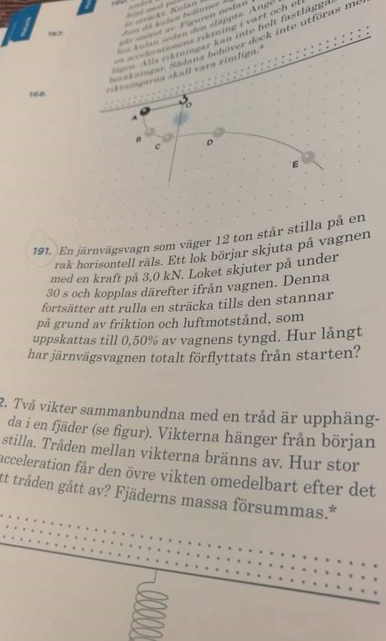 Stämmer bra det. Det var ett slarvfel... Men jag fick ut den andra accelerationen som 0,0491 m/s^2. Jag söker nu efter den totala sträckan. Så jag tog först reda på inbromsning tiden med hjälp av v=v0+at. Sen räknade jag ut s1 och s2. Jag la ihop dem.
