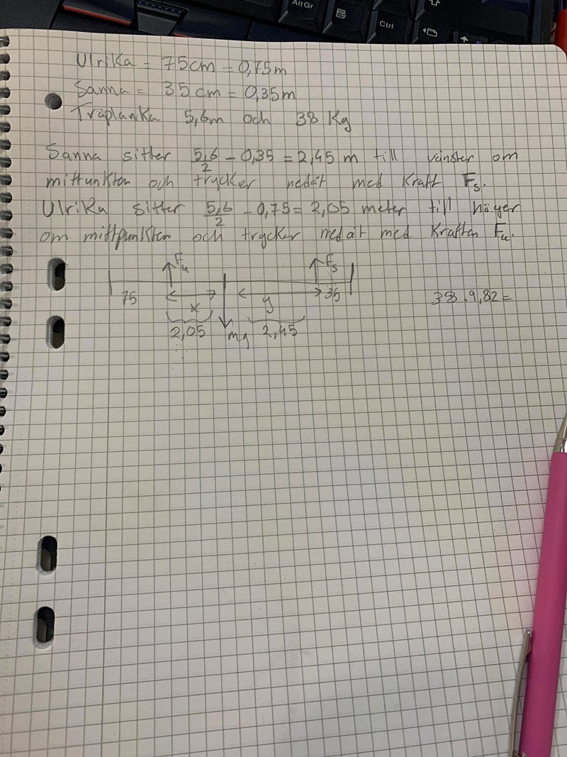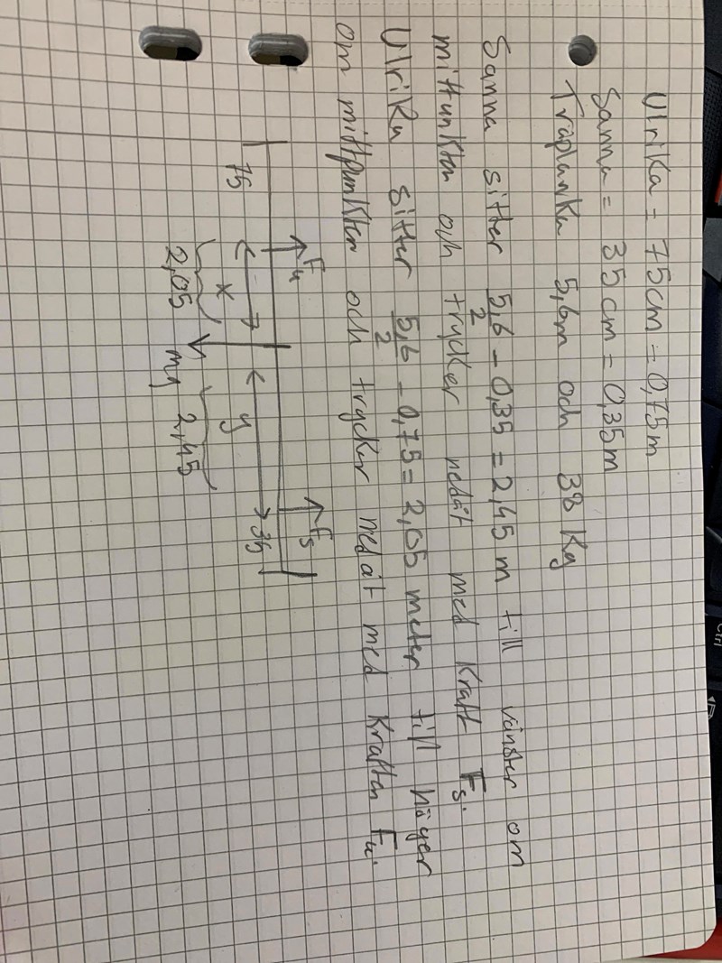 Du vet att FU + FS = mg (de hjälps ju åt att lyfta plankan) och att 2,05 FU = 2,45 FS (plankan roterar inte). Kommer du vidare?