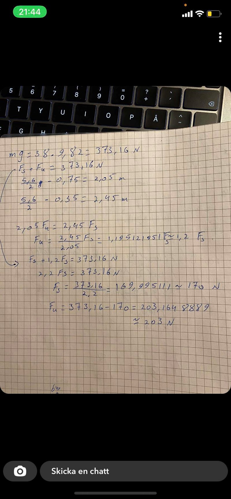 Du har gjort rätt beräkningar, så om det blir fel så beror det på att du har slått fel på miniräknaren eller gjort fel med huvudräkning:)Om du vill att det ska gå snabbare med den här sortens uppgifter, där föremålets vikt och längd och momentkrafternas angreppspunkter (5,6-0,75 m och 5,6-0,35 m ) är kända och du ska ta reda på momentkrafterna, så kan du titta på det här youtubeklippet: https://m.youtube.com/watch?v=fRfJdd47Zn4 Du kan spola fram till 10:16 så kommer en exempeluppgift som liknar din uppgift.