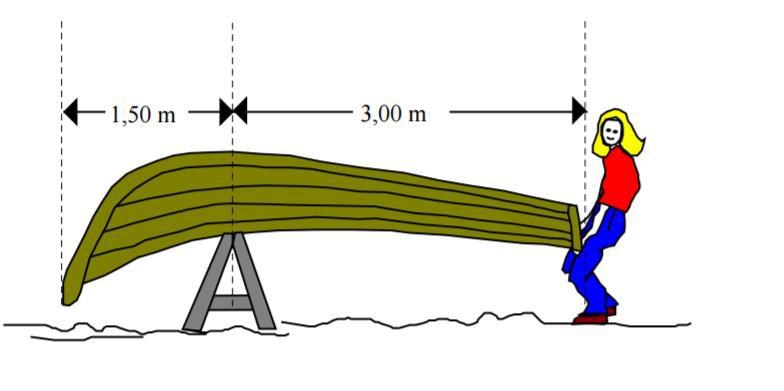 2. En båt ska placeras upp och ner på bockar. Under arbetets gång står en person och håller upp båtens akterända medan den ena bocken stöder i det läge som figuren visar. Båten väger 180 kg. Personen, som väger 54 kg, lyfter rakt uppåt med kraften 350 N. Hur långt från akterändan går lodlinjen genom båtens tyngdpunkt?