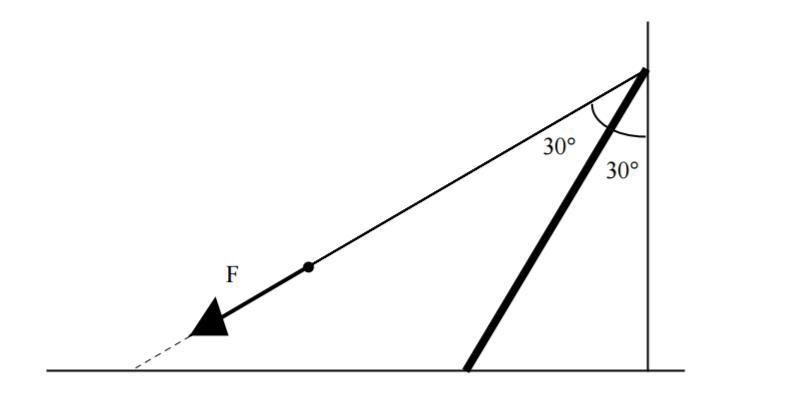 3. En stege som väger 40 kg står lutad mot en vägg (se figuren). För att man ska kunna ändra stegens läge har man fäst en lina i stegens övre ände. Linan bildar vinkeln 60° med väggen. Med vilken kraft F måste man minst dra i linan för att stegens kontakt med väggen ska upphöra?
