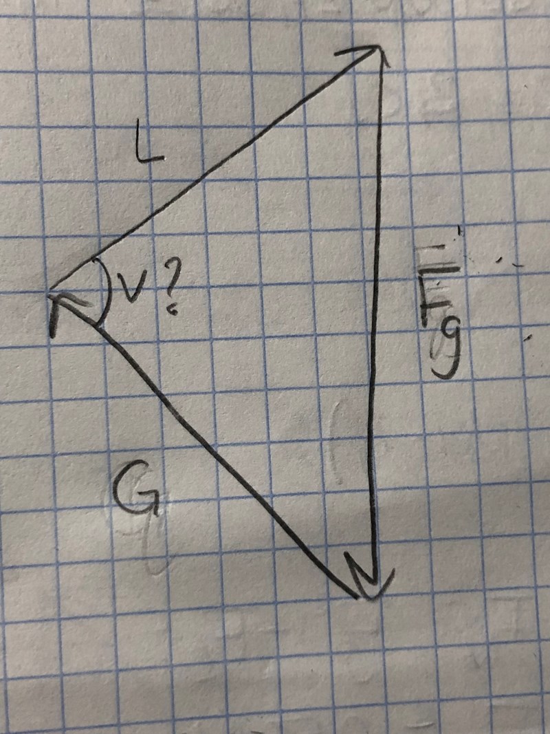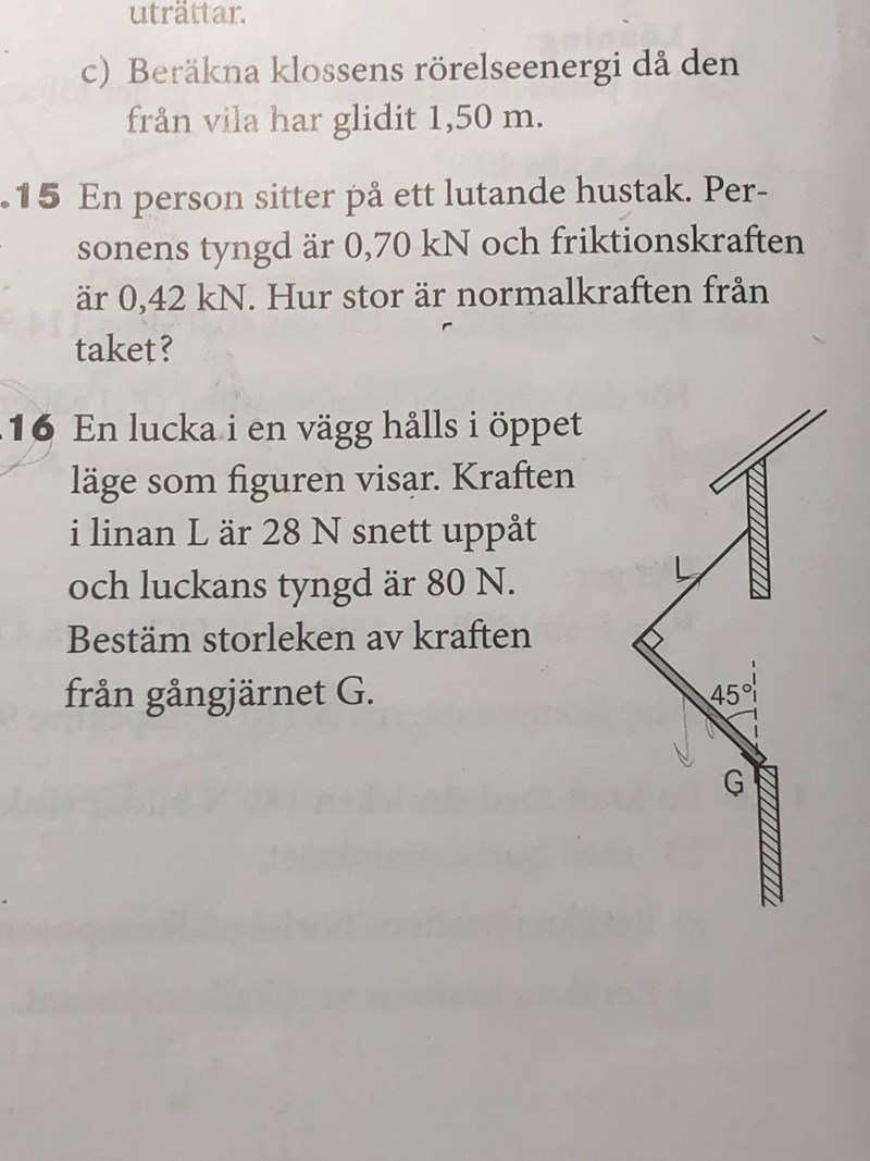 Hej, behöver hjälp med 16. Jag undrar varför kraften G inte blir vinkelrät med kraften L. Jag testade att använda mig av Pythagoras sats först för krafterna. Då det är 90 grader mellan linan och luckan tänkte jag att samma sak då måste gälla för krafterna, men det blev fel.
