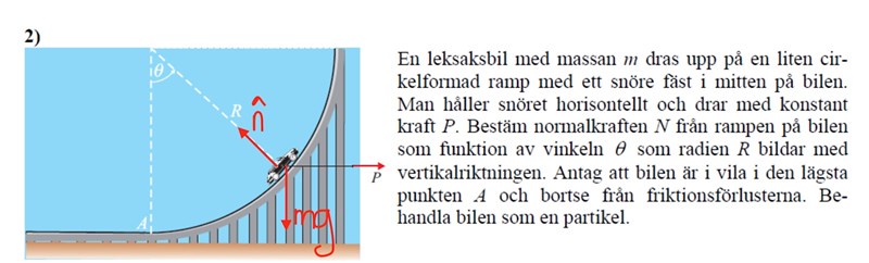 mv2 kan du räkna ut med energimetoder. Den mekaniska energin bevaras. Notera att normalkraften inte utför något arbete.