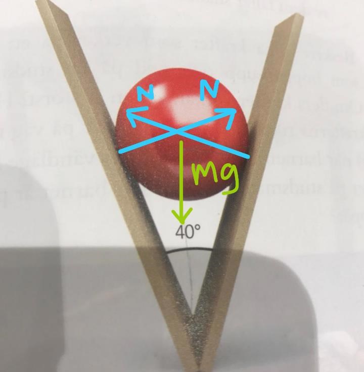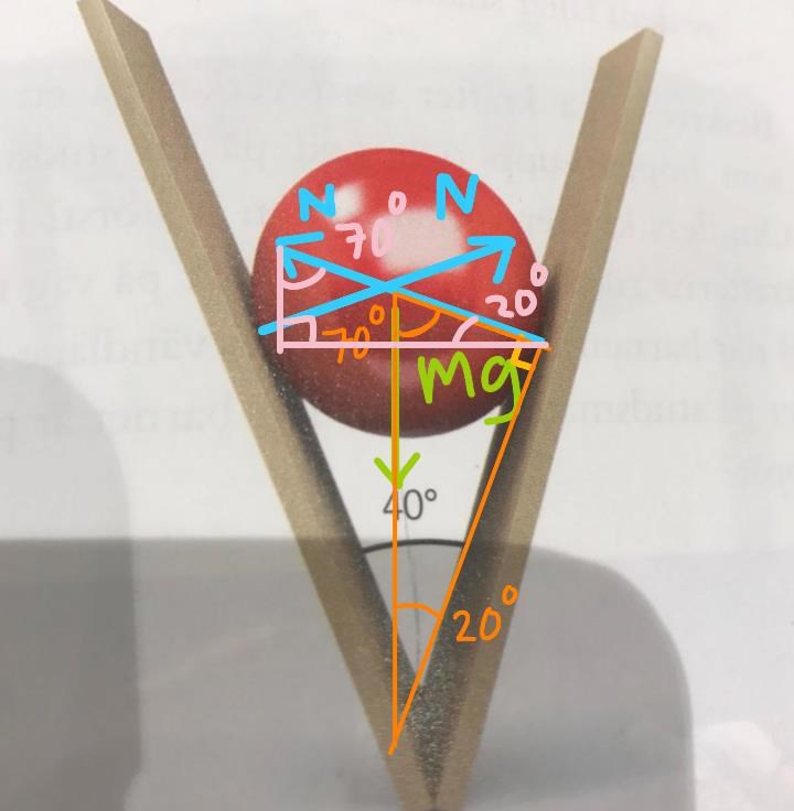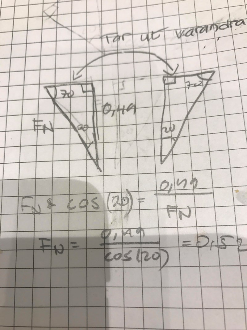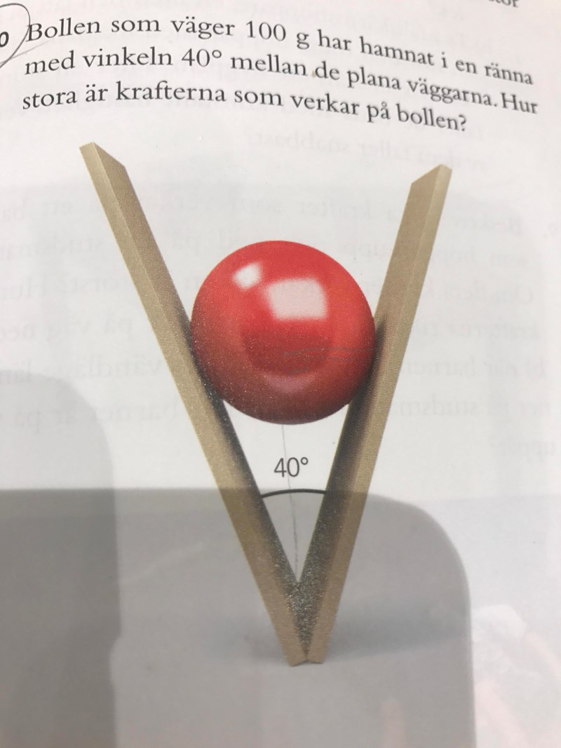 hej! Jag behöver hjälp med uppgiften nedan. Jag uppfattar att man först räknar ut tyngdkraften och att normalkraften som verkar på bollen där den berör de två brädorna är lika stor som tyngdkraften då bollen är i vila. Jag vet också att normalkraften delas i två eftersom bollen rör ytan på två ställen och därför delas upp. Men när jag väl ritar upp kraften som en triangel får jag att normalkraften bli cos (20) x F istället för cos (70) x F som jag har för mig att det ska bli. Kan någon snälla rita upp triangeln med krafter då jag inte lyckas rita upp den rätt?