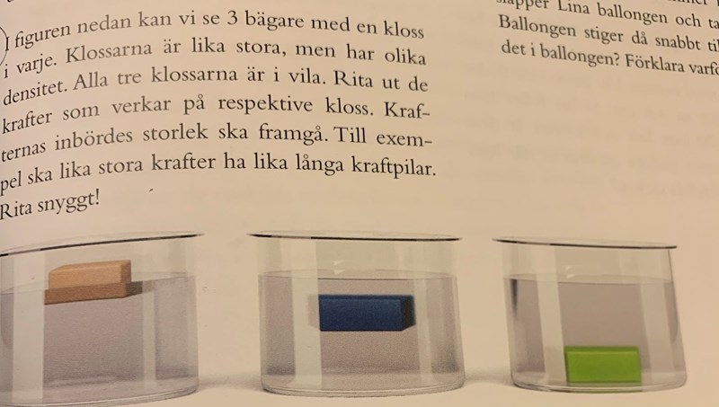 I fallet längst till höger kan inte lyftkraften motverka tyngdkraften ens när klossen är helt under vatten, därför sjunker den till botten. Väl på botten finns en normalkraft som tillsammans med lyftkraften motverkar tyngdkraften fullt ut.