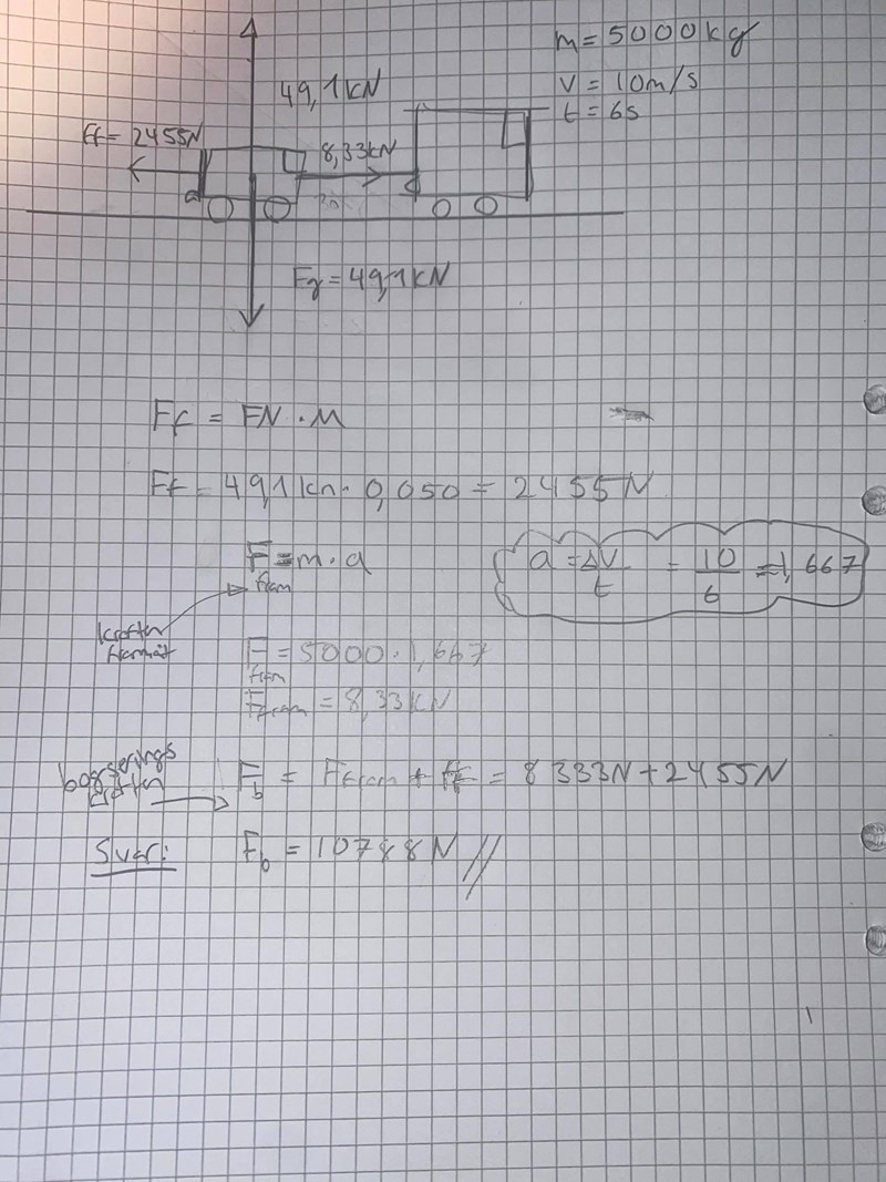 "En mindre lastbil med massan 5,0 ton bogseras längs en horisontell väg. Dess hastighet ökar från noll till 36 km/h på 6,0 s. Hur stor är bogserkraften om rörelsefriktionstalet är 0,050?" Tacksam för hjälp