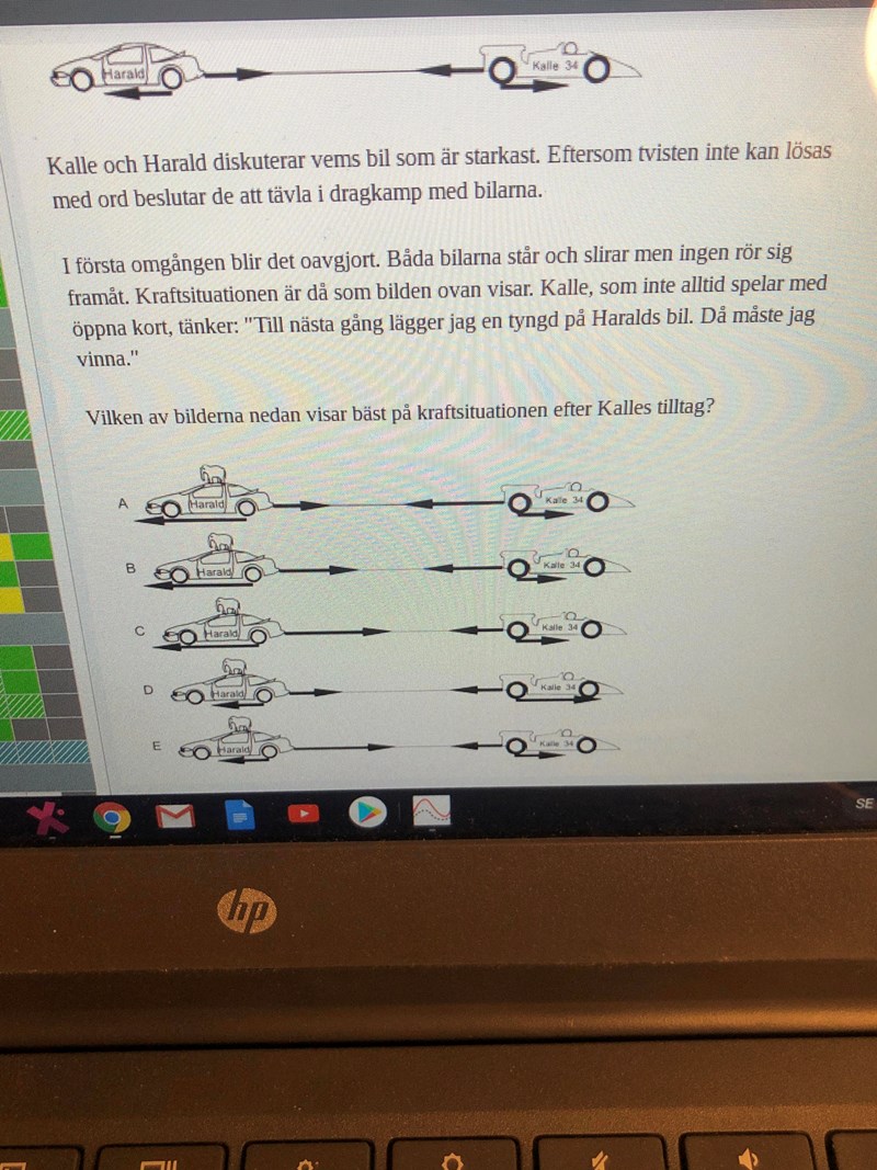 Nja, resonemanget håller inte. Friktionskraften brukar man skriva som Ffrik=N, där är friktionskoefficienten och N är normalkraften. Om Haralds bil blir tyngre så ökar N och Ffrik (om vi antar att är oförändrad). Det betyder att du kan utesluta D och E eftersom Haralds friktion inte har ökat i de bilderna. Nästa ledtråd är att det var oavgjort utan tyngd. Det var alltså kraftjämvikt. Alla krafter tog ut varandra eftersom ingen rörde på sig. Råder det kraftjämvikt i med tyngd också? Om ja så kan du utesluta bilderna där kraftpilarna inte tar ut varandra. Om nej så kan du utesluta bilderna där krafterna tar ut varandra. Sen får du fundera ut annat som måste/bör gälla för att utesluta tillräckligt många bilder. Det är en svår fråga tycker jag. Man måste ha en god förståelse för fysiken och man måste tänka en hel del. Det är alltså en jättebra fråga :)