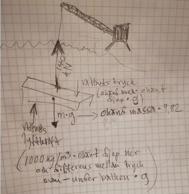 Haha, tack;) Ok - då har jag missförstått något. Har läst om Arkimedes princip idag. Såg också ett experiment i min digitala bok där de visade hur vatten "tog" en del av lyftkraften från fjädern i en dynamometer om man hade ett föremål med en viss tyngd fäst i dynamometern. Alltså man kollar med hur stor kraft dynamometern drar i föremålet. Sen sänker man ner det i vatten utan att röra sidorna av behållaren vattnet är i. Då minskar kraften dynamometern drar i föremålet med. Vattenbehållaren stod på en våg - man kunde även sen att vikten på vågen ökade motsvarande minskningen på dynamometern (-är detta relaterat till det du säger om att summan av krafterna måste bli noll?). Därför har jag tänkt att utöver lyftkranens drag ska även vätsketrycket trycka underifrån på balken efter att den lyfts. Och det påstås även i min bok att det är större vätsketryck underifrån föremålet än på ovansidan, eftersom botten av föremålet är längre ner än toppen, så vätsketrycket är lite större där. Har jag alltså missförstått det?