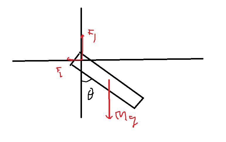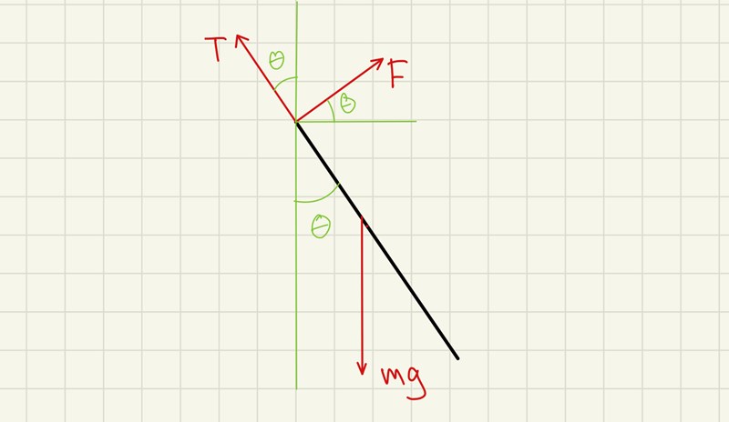 Okej, nu antar jag att det finns en kraft T som verkar tangentiellt vid vridpunkten och en kraft F som verkar vinkelrätt mot pendeln. Då får jag: