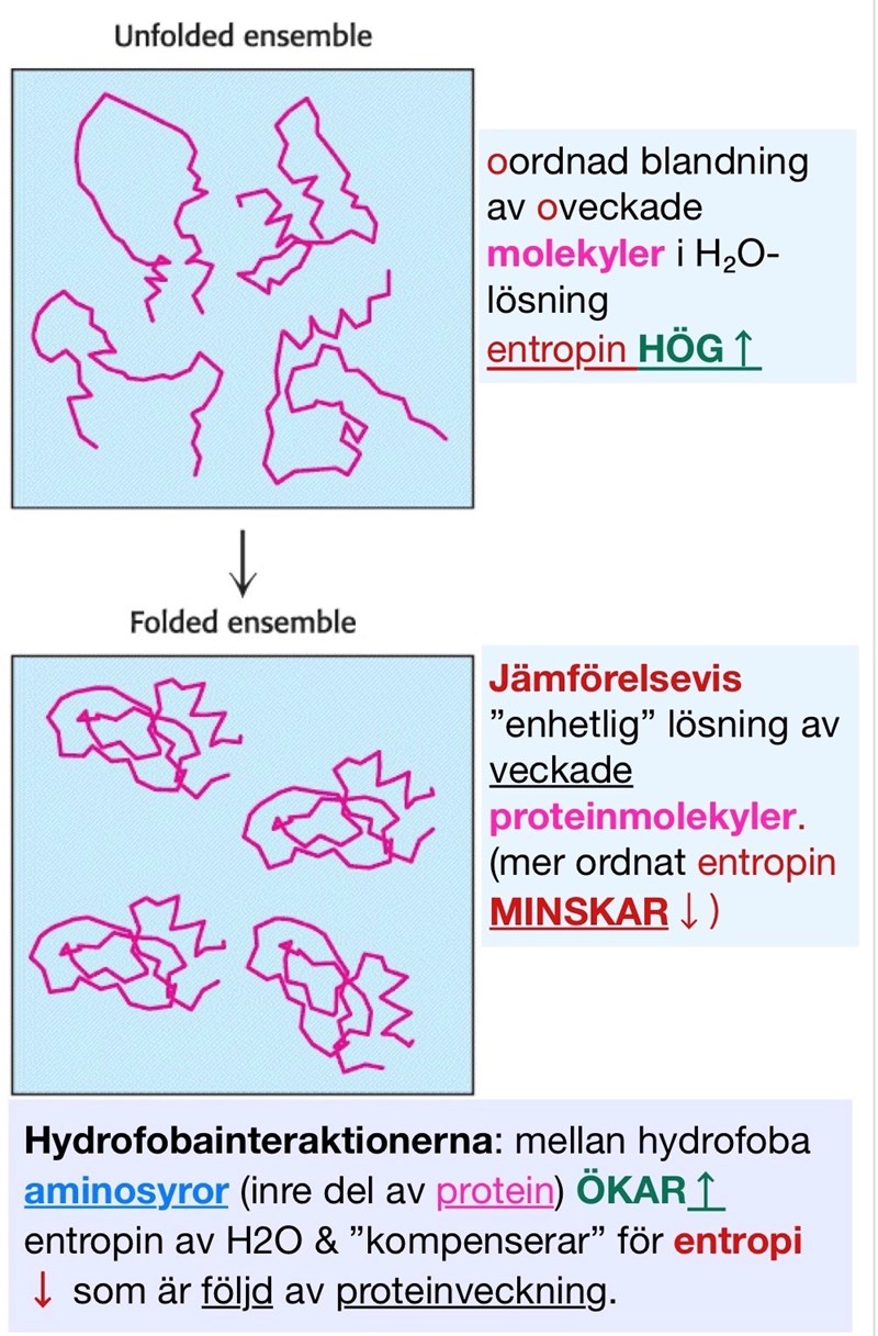 Proteinveckning: Är med på att hydrofoba aminosyrorna i proteinets inre ”kompenserar” entropi minskningen som sker under proteinets veckning (högt ordnade struken av de färdig veckade proteinet=minskat entropi) genom att de just arrangerar sig i proteinets inre och fortsätter därmed h2o molekyler. Det gör att H2O molekylernas entropi ökar. Samt att andra svaga bindningar faciliterar proteinveckning processen och stabiliserar det färdig veckade proteinet 3D konformation.. men förstår inte riktigt hur menar man att när man skriver i min bok ”Dessa interaktioner ersätter interaktioner med H2O som äger rum i det ovikta proteinet”. När man syftar på andra svaga bindningar som faciliterar proteinveckning (ink. van der der waals, vätebindningar)