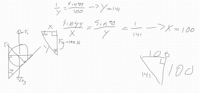 Jag greppar inte varför mg och gul är lika - men efter ett nytt försök får jag att krafterna är 100N och 141N. Detta känns inte rimligt eftersom två krafter tillsammans ska ge en resultant med samma kraft och riktning som mg. Men trigonometrin ger mig inget annat resultat.