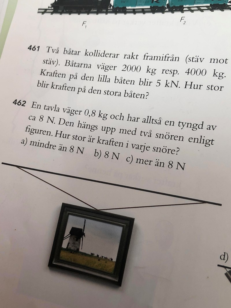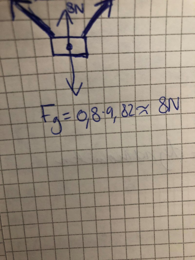 Hur kan det vara mer än 8N om tavlans tyngdkraft fördelas på två trådar/snören? Då borde svaret bli 4N i varje snöre? Eller?