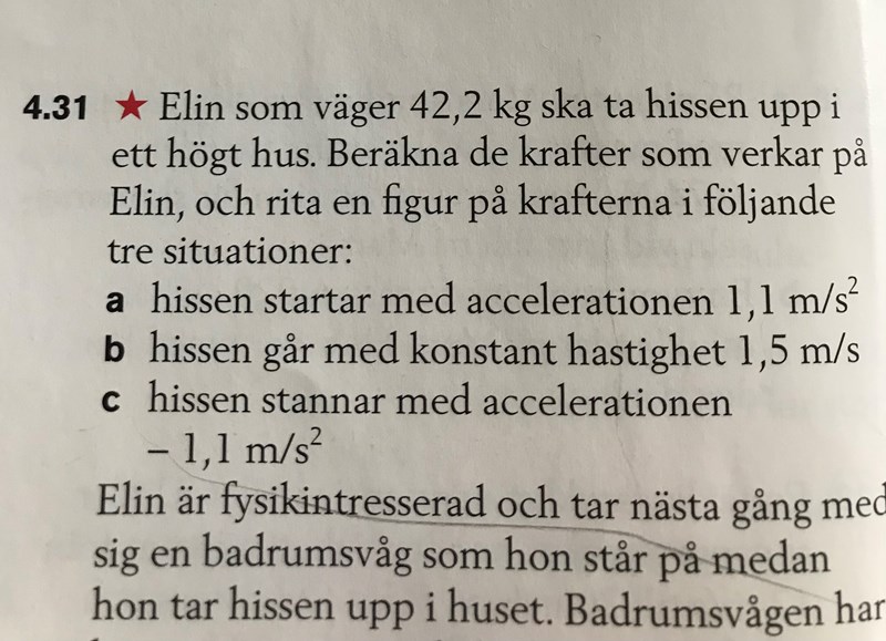 Och borde inte Elin typ borra ner sig i hissens golv eftersom kraften uppåt i c) är mindre än tyngdkraften ner?