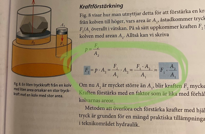 Trycket i vätskan är ungefär samma överallt, . Detta gäller vid såväl som . Eftersom trycket ska vara samma och arean är olika måste även krafterna vara det.