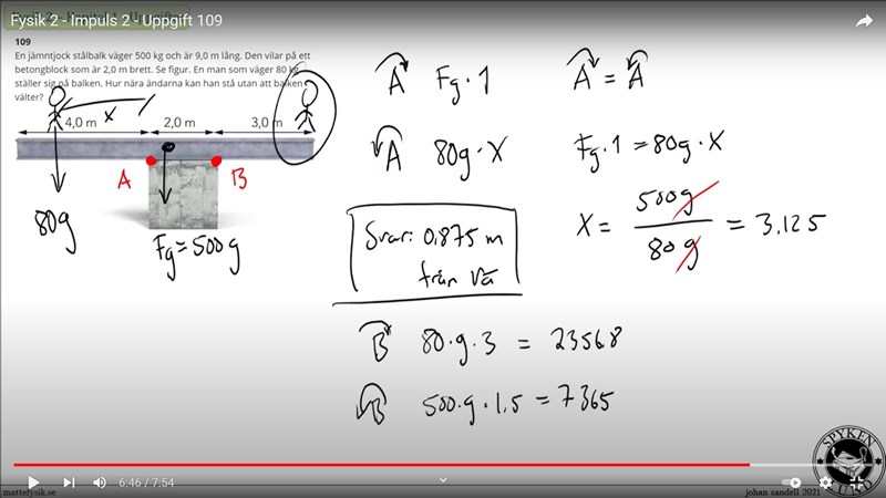 En jämntjock stålbalk väger 500 kg och är 9,0 m lång. Den vilar på ett betongblock som är 2,0 m brett. Se figur. En man som väger 80 kg ställer sig på balken. Hur nära ändarna kan han stå utan att balken välter?