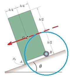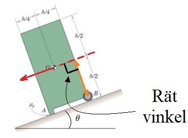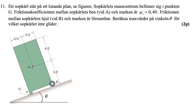Man ska beräkna maximala vinkeln theta för vilket soptunnan inte glider, mina beräkningar är likadana som facit förutom att de har räknat med x-komposanten för tyngdkraften i momentjämviktsekvationen och det gjorde jag inte men förstår inte varför de gör det, det är väl endast den rätvinklade komposanterna mot momentpunkten som verkar?