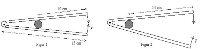 Erik försökte knäcka en hård nöt med en nötknäckare. Nötknäckarens längd var 15 cm. Han lade först nöten 10 cm från de fria ändarna på nötknäckaren. Se figur 1. Erik pressade sedan med kraften F. Kraften på nöten var då 300 N, men den gick ändå inte sönder. Då flyttade Erik in nöten så att den låg 14 cm från ändarna och pressade med samma kraft. Se figur 2. Då knäcktes nöten. Hur stor var kraften på nöten då?