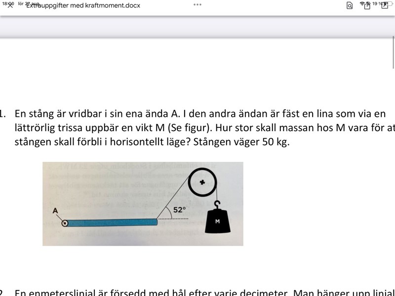 Hej! Jag förstår inte denna uppgift. Tänker att kraften av stångens vikt är lika stor som trissans uppåtriktade kraft men längre än så kommer jag inte :(