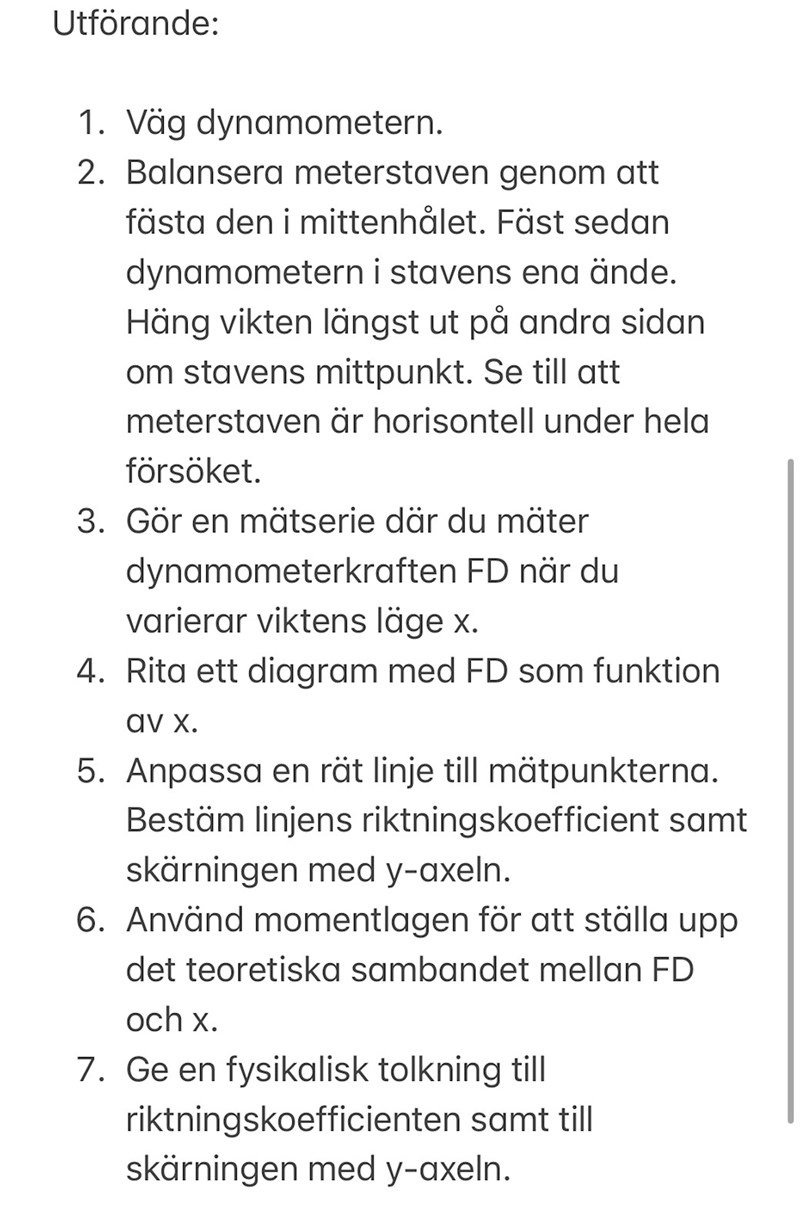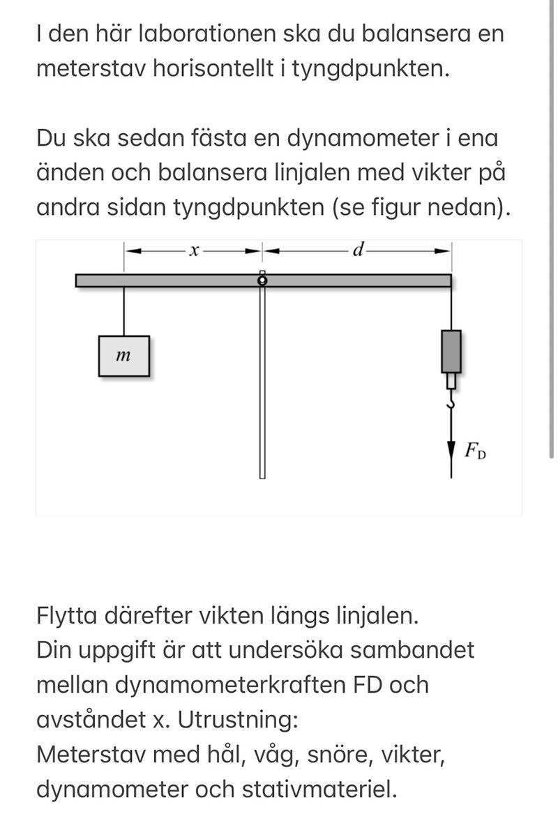 Men om vikten m är i vridningspunkten, räknas den med i kraft momentet? m=100g och om x=0 då blir f(x)=1,0, eller är det dynanometern+staven?