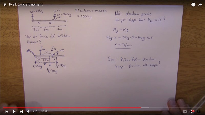 CurtJ skrev:Nu vet jag inte hur frågan är formulerad men om du har räknat fram jämvikten till 8.3 m så börjar det tippa vid 8.3 m. Ett alldeles så litet momentöverskott åt ena eller andra hållet får ju plankan att rotera (i det ideala fallet, i verkligheten kan det finnas friktionsmoment som ska övervinnas men det är försumbart.)