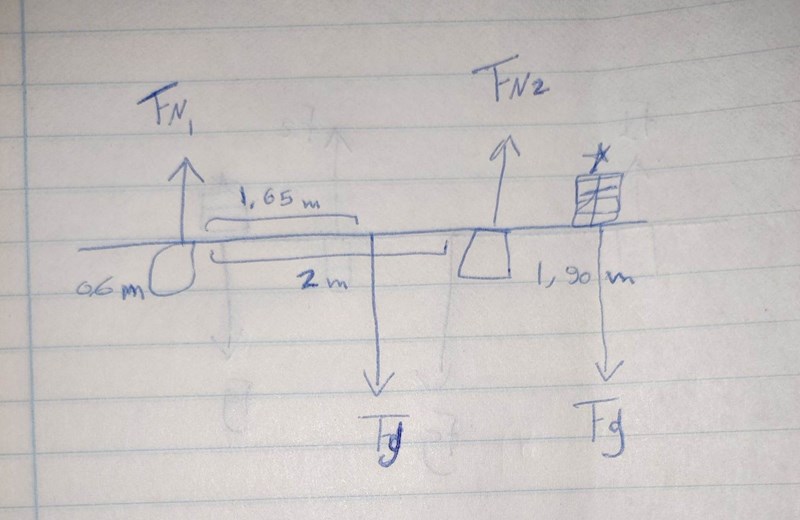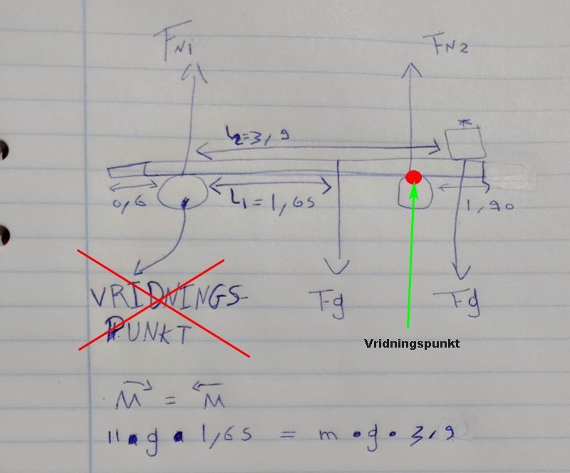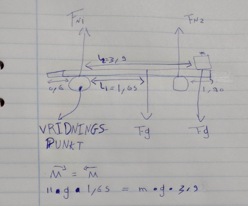 Jag valde momentpunkten vid den vänstra balken, kraften F2 har ingen moment. Sedan beräknade jag sträckan från vridpunkt till masscentrum som blev 1,65 m.