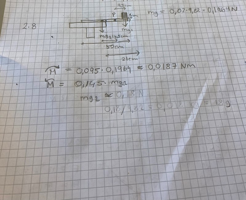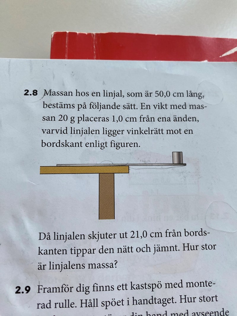 haraldfreij skrev:Du har inte tagit med normalkraften från bordet, utan bara gravitationskrafterna för linjalen och vikten. Räknar du på momentet kring bordskanten så får ju normalkraften ingen hävarm, så momentet blir noll, men med en annan axel måste du ta med den.