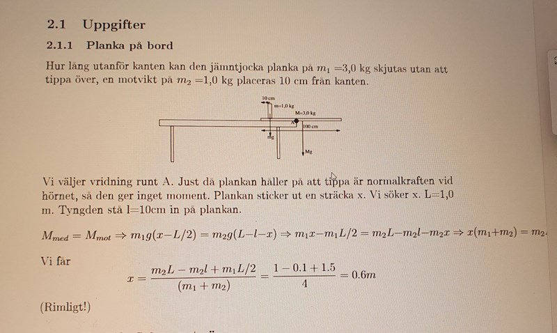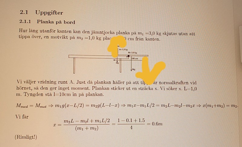 För att veta vilka krafter som bidrar till moment och om de går medurs eller moturs är det lättast att frilägga plankan. I det här fallet kommer plankan rotera medurs och därmed bidrar alla krafter som är nedåtriktade till höger om vridpunkten till ett moment medurs (m1g) och krafter som är nedåtriktade till vänster bidrar till ett moment moturs (m2g). Normalkraften från bordet pekar uppåt men går genom vridpunkten och skapar därför inget moment som jag skrev tidigare.