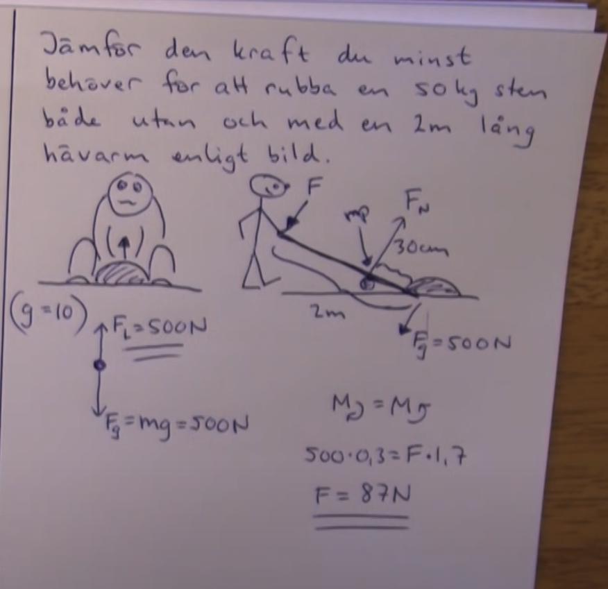 Man använder av spettet som en hävstång. För att stenen skall röra sig behövs det att kraften som vrider spettet moturs (gubben som trycker neråt) gånger avståndet från balanspunkten till gubbens kraft är större än kraften som vrider spettet medurs (stenens tyngd) gånger avståndet från balanspunkten till stenen. Hävstångsformeln är F1l1 = F2m2, d v s F1.1,7 = 50g.0,3 d v s F1 = 50g.0,3/1,7.