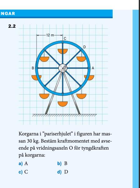 Hej! Jag har en usel tendens att göra uppgifter svårare än vad de är. I denna så började jag räkna på alla korgarnas samlade massa och använda mig av trigonometri när allt de vill ha i princip är F·l för de olika korgarna. Min fråga är. Vad menar man när man säger bestäm kraftmomentet? Är det bara F·l=Nm för korgarna här? Behöver jag inte snurra runt med jämvikt och att F resultanten skall vara 0? Hur hade det stått om jag i sådana fall hade behövt det?