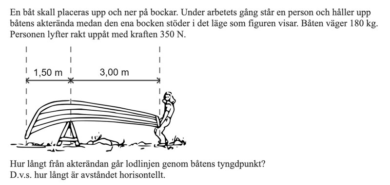 I första delen har jag räknat ut kraften som båten har på bocken för att i andra delen kunna räkna ut avståndet till mittpunkten från akterändan. Jag får svaret 2 men svaret är 2,41. Vad gör jag fel? Tacksam för all hjälp!
