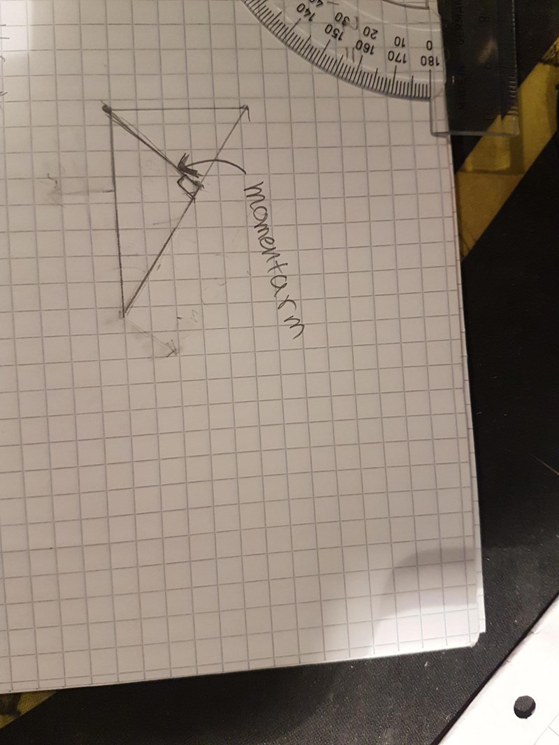 För att det ska råda jämvikt skall summan av momenten vara lika stora i de olika rotationsriktningarna. Alltså måste momentet upp vara lika stort som momentet ner: momentet ner är 3.2kg * 0.6m *g