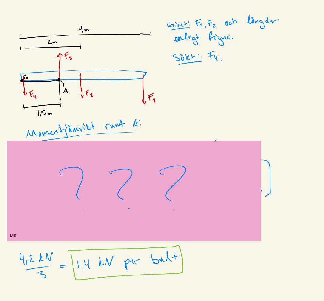 Nu fattar jag dock, glömde att man behövde dividera med 1,5 m (distansen från vridpunkten för bultarna) och detta ger newton vilket man då kan dividera med tre för att ta reda på respektiv bult. Det blir såhär då: