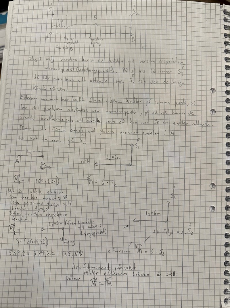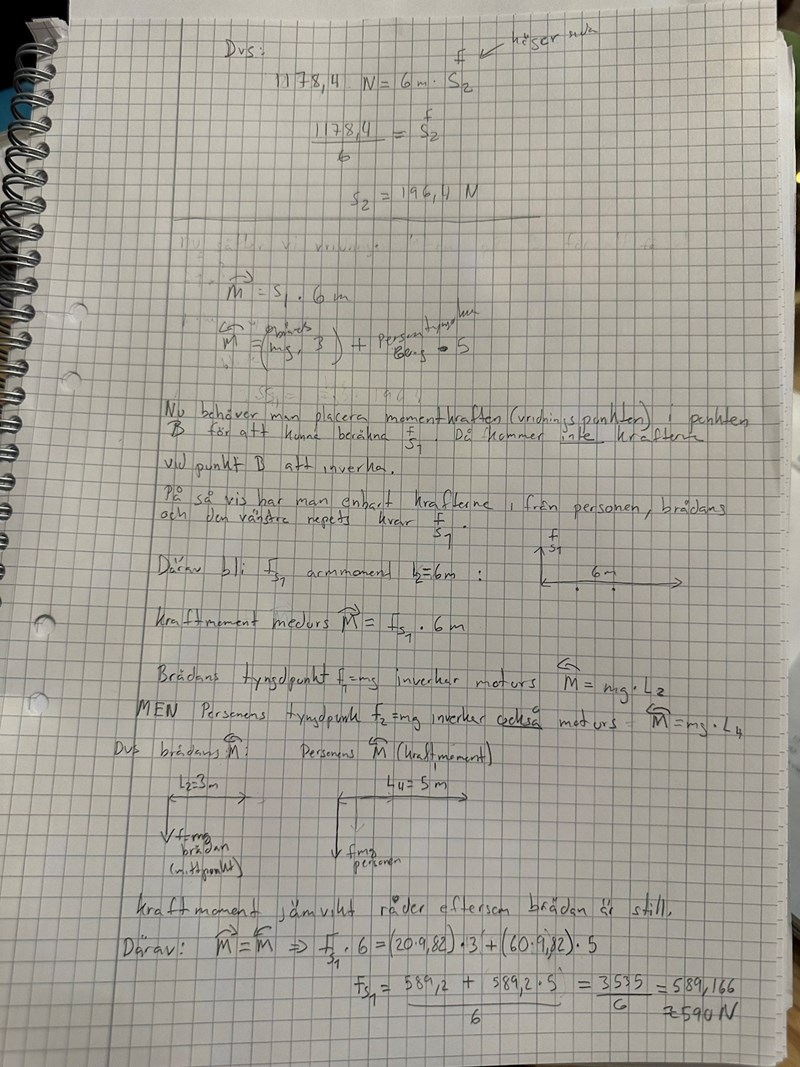 Du har kommit fram till rätt svar, men lösningen är lite onödigt lång och innehåller dessutom ett fel, där du skriver att ett moment har enheten N. Eftersom moment är kraft multiplicerat med sträcka så är enheten istället Nm.