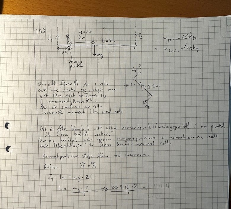 och Kraftmomenteb ska vara i varsin ände av brädan vid f1 och f2