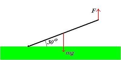Uppgift: En jämntjock stång som är 2,4 m lång är fritt rörlig kring en punkt på marken. Stången väger 12 kg och hålls uppe av en kraft F. Hur stor är kraften F? (svara med 2 värdesiffror)