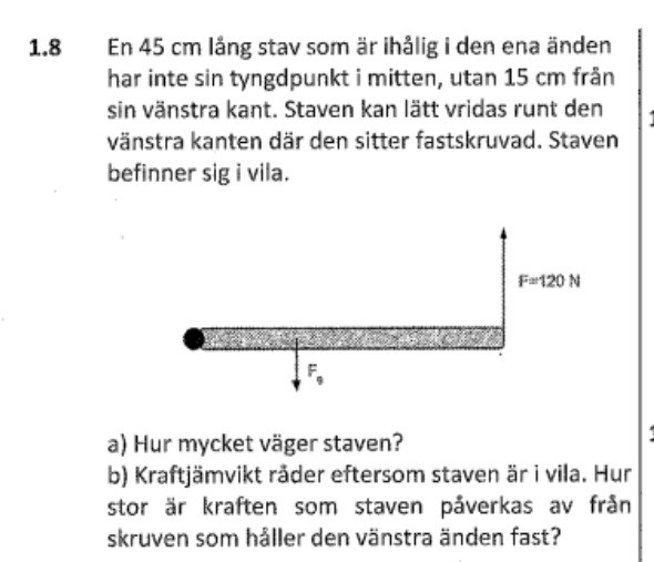Jag har absolut ingen aning hur jag ska komma fram till a och b. Jag tänkte att om staven befinner sig i vila så är M(modurs)= M(moturs) och då sätta momentlagarna ekvationer tillsammans. Men har bara den ena ekvationen--) M(moturs)= 120x 0.45 , vad ska ens stå i den andra? Behöver verkligen hjälp