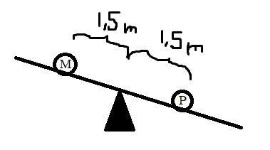 P och M sitter 1.5 m på vardera sida av gungans mitt. M väger 25 kg och P väger 65 kg. Var ska person D sätta sig om gungan ska vara i jämvikt. D väger 18 kg och gungan är 6 meter lång.