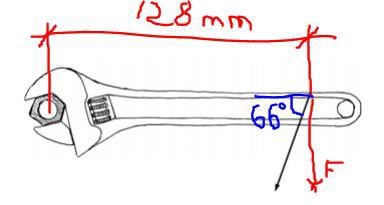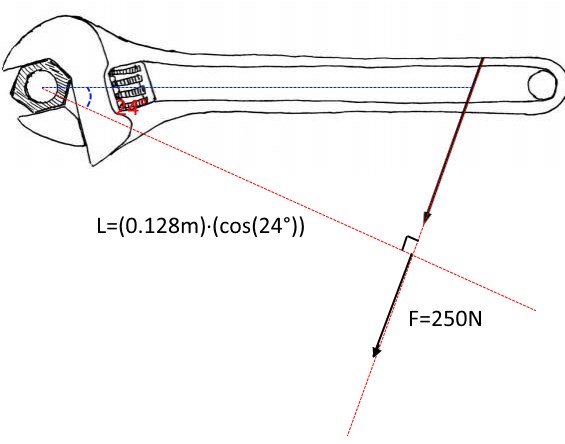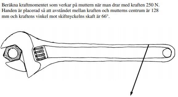 Jag har fastnat på denna uppgift. M=Fl där F=250 N. Momentarmen l måste vara vinkelrät till kraften (som jag antar är den svarta pilen i uppgiften, men det är lite oklart för mig om vilken längd det är som jag ska räkna ut och vart vinkeln ska vara.