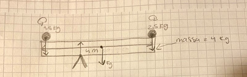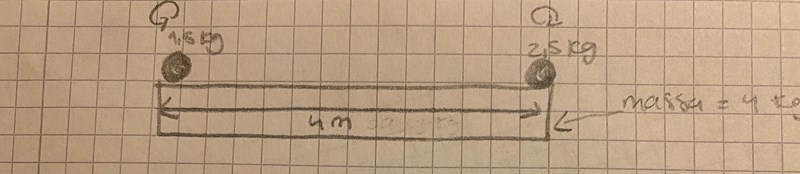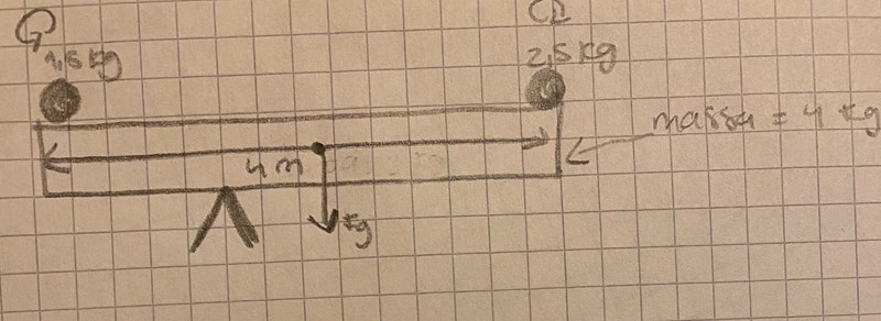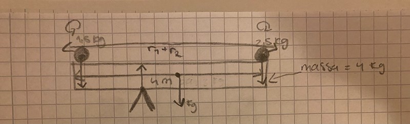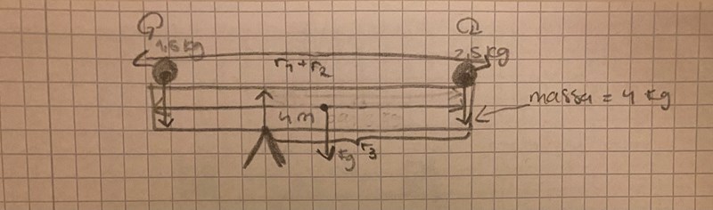 Jag har en planka som väger 3 kg och är 4 m lång. Längst ut på plankan placeras vikter. På ena sidan är vikten 1,5 kg och på andra 2,5 kg. Vart ska stödet mitten placeras för att plankan ska befinna sig i jämvikt?