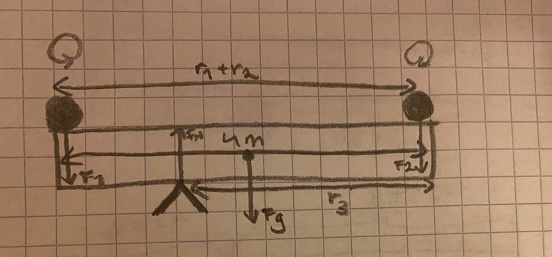 Och hur gör du med problemet med de två obekanta r1 och r2? Och mg måste få en hävarm.