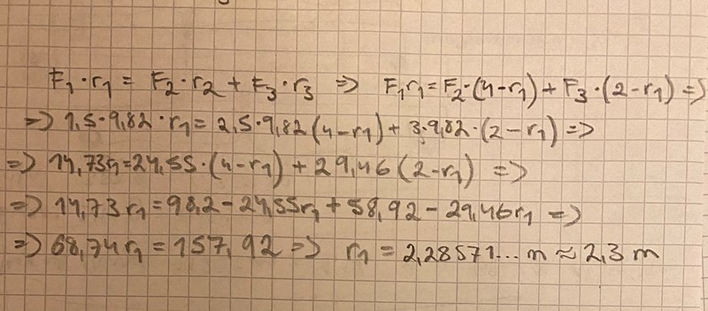 Nu är alla krafter och avstånd markerade. Så F3r3=mg •r3=mg•2=2mg så F1r1 = F2•(4-r1) + F3r3 => F1r1 = F2•(4-r1) + 2mg